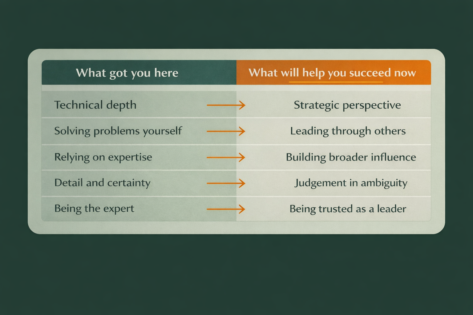 It may be especially relevant if you are no longer asking, How do I prove I know enough? and are starting to ask, How do I lead at the level this role now requires?