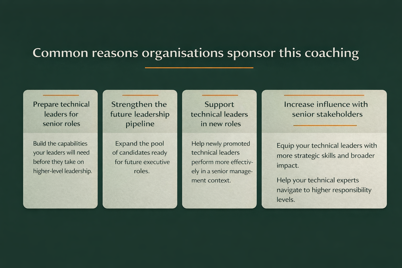 Organisations often sponsor this coaching when a technical leader’s capability is already clear, but their next level of impact depends on stronger senior-level leadership.